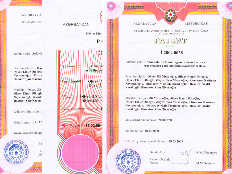 16) Патент на изобретение 1 2009 0191. Зарегистрирован 30.10.2009 г. Государственным агентством по стандартизации, метрологии и патентам Азербайджанской Республики.